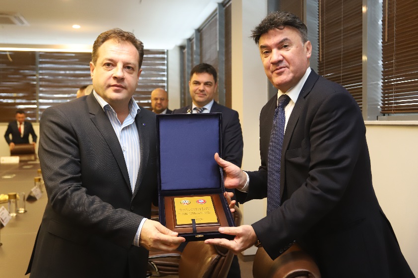 Босът на УЕФА е в столицата, където се срещна и с премиера Бойко Борисов, а срещата с представители на Националното сдружение на Общините в България се проведе на Националната футболна база. Сред основните теми на срещата бе сътрудничеството между УЕФА, БФС и Общините в България. Обсъдени бяха различни възможности за подобряването на инфраструктурата на детско-юношеските школи в различните региони на страната с помощта на УЕФА, БФС и Общините, както и прилагането на новата програма на УЕФА за училищен футбол и успешното продължение на програмата „Грасрутс“.