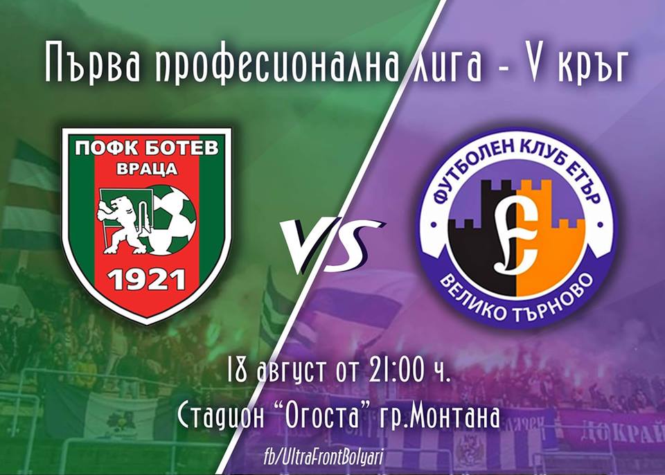 „Етър” гостува на новака в елита “Ботев” (Враца) в петия кръг на Първа лига. Мачът е днес от 21:00 ч. на стадион “Огоста” в Монтана, където домакинстват врачани, докато стане готово електрическото осветление на стадиона им. Главен съдия е Волен Чинков с помощници Мирослав Иванов и Павлин Михайлов, четвърти съдия Станимир Тренчев, съдийски наблюдател – Константин Писков.