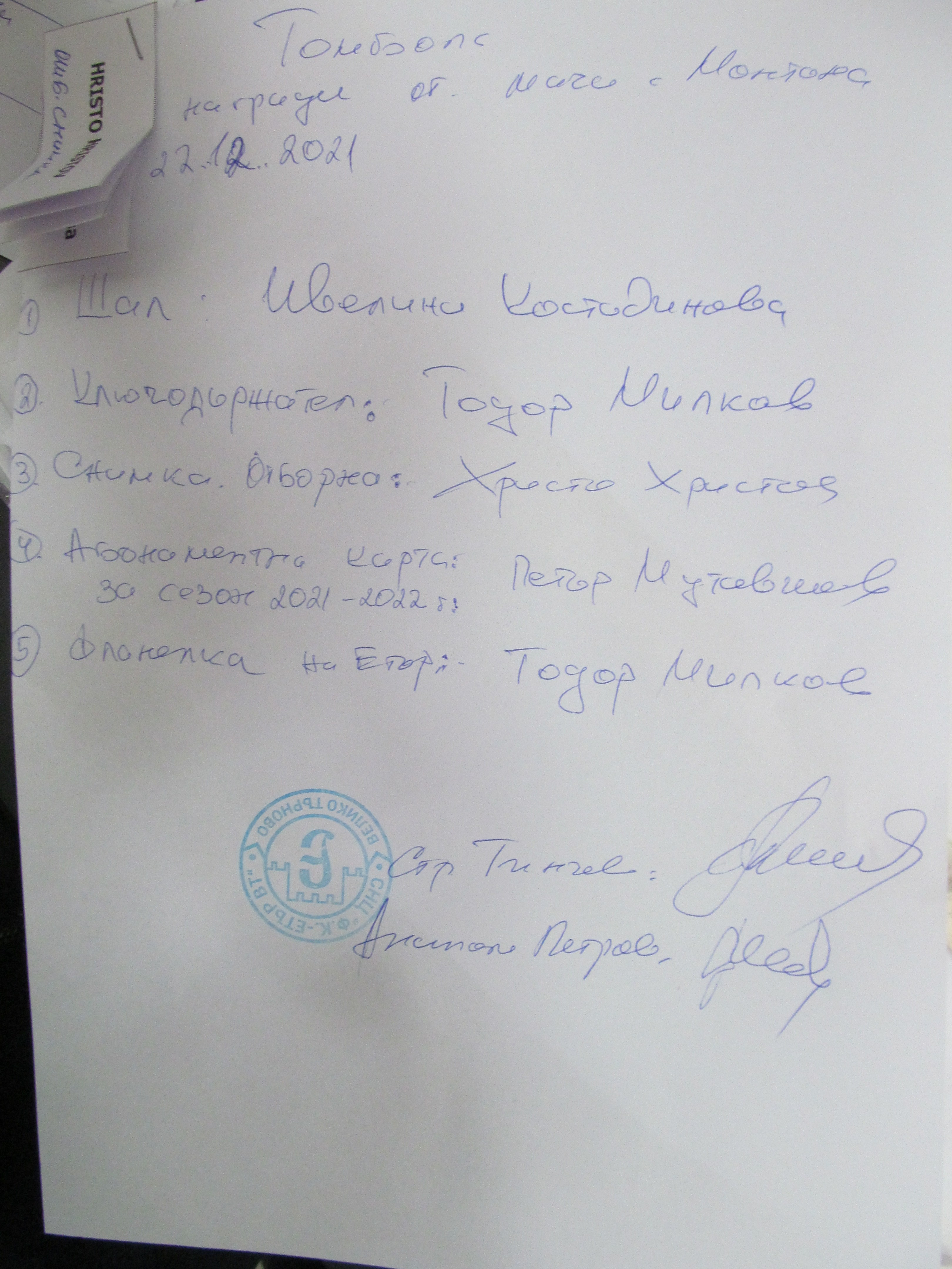 В урната за томболата името на всеки от привържениците бе поставено толкова пъти, колкото билета е закупил за мача. Тя бе теглена от административния директор на „Етър” Страцимир Тинчев на живо в страницата на клуба във Фейсбук.