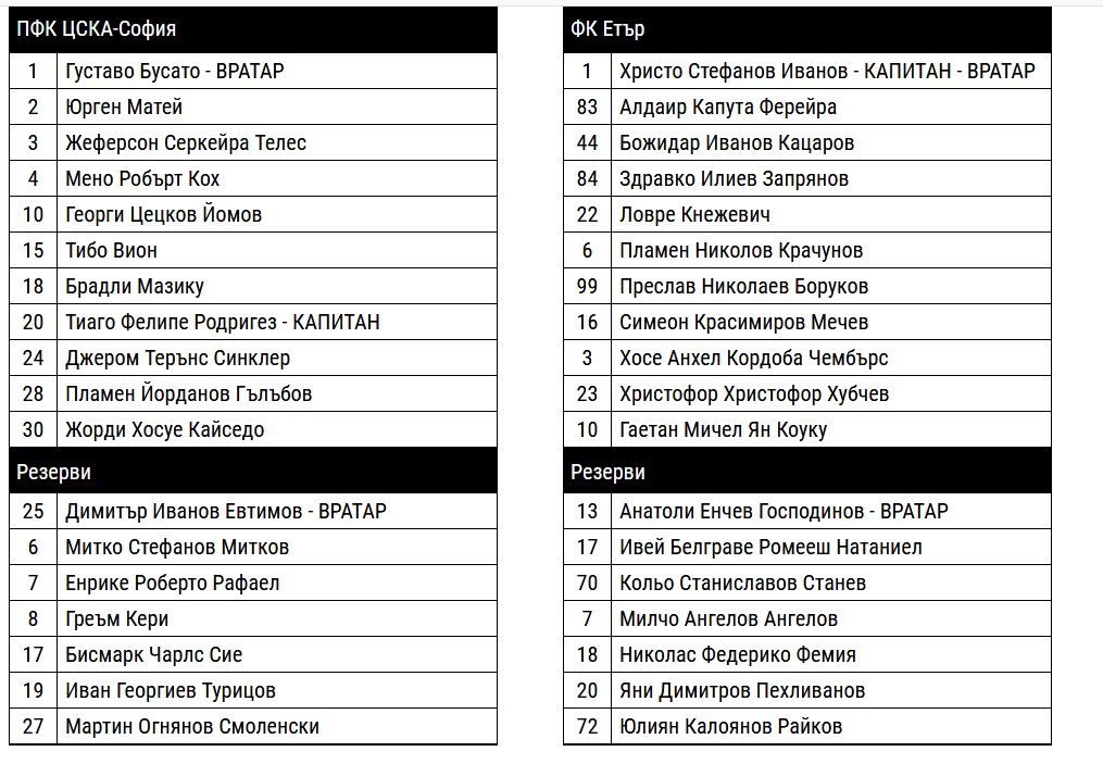 Стартовите състави на ЦСКА-София и “Етър” за мача, който започва от 17:00 ч. на стадион “Българска армия”.