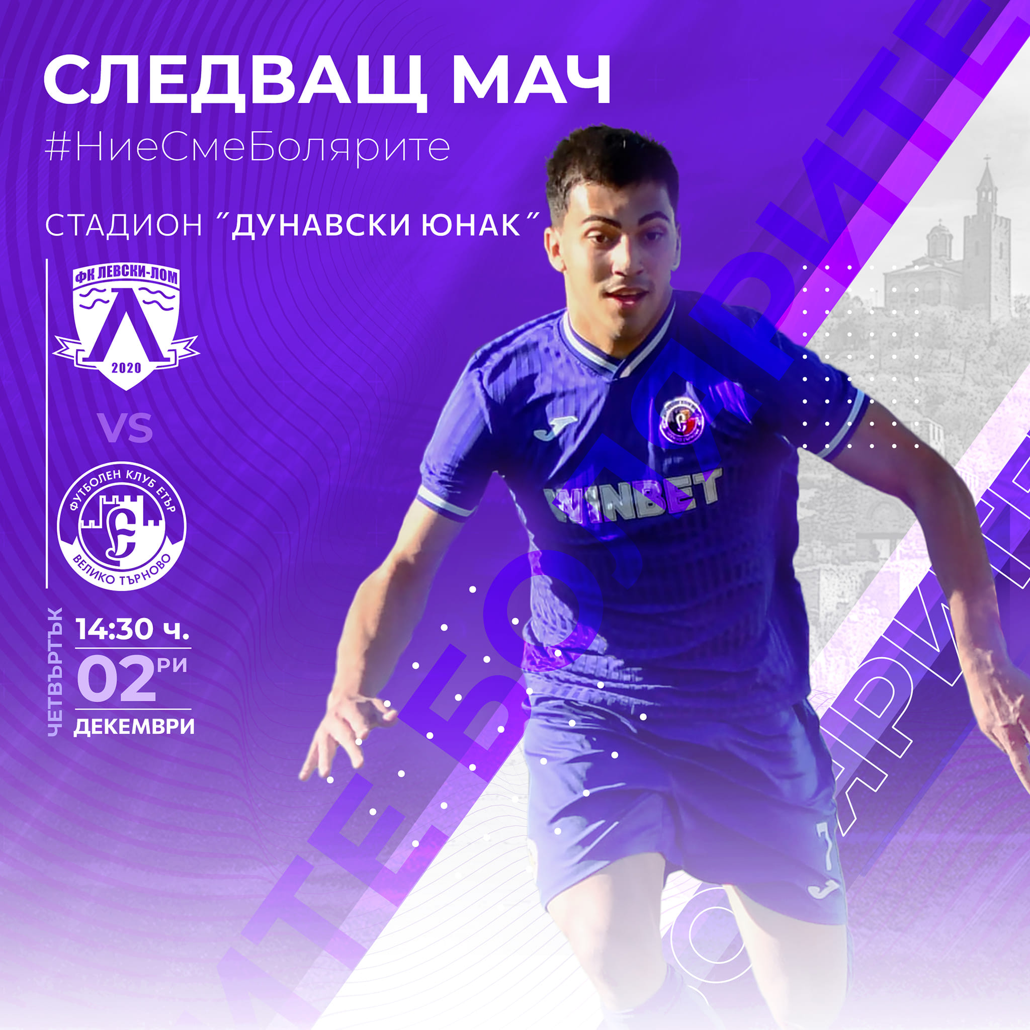 На “Етър” предстои гостуване на последния в класирането “Левски” (Лом). Мачът е в четвъртък от 14:30 ч. в Лом с главен съдия Ивелин Занев от Русе, асистенти Калин Киров и Живко Петров, четвърти рефер Борис Попов и съдийски наблюдател Милко Николов.