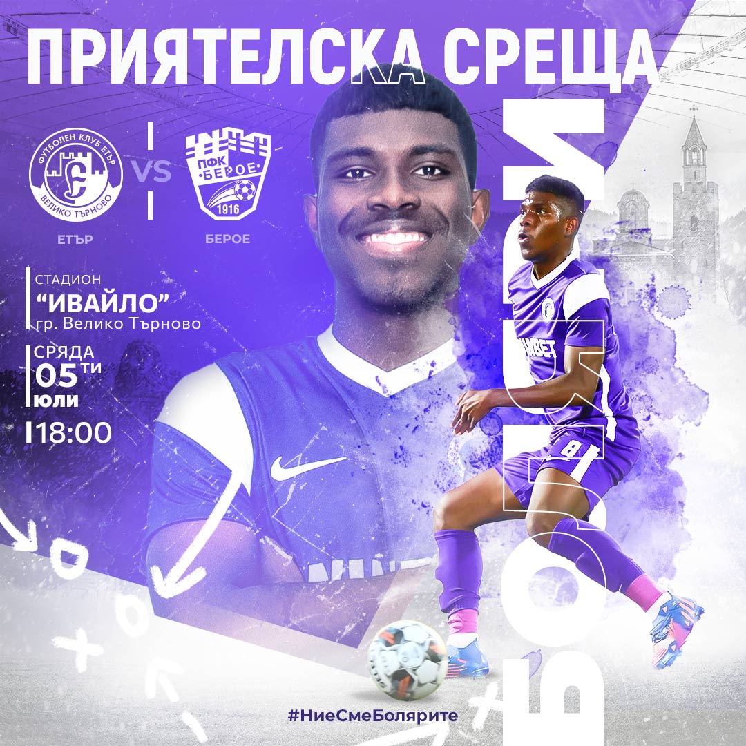 Обновеният състав на „Етър“ за предстоящия сезон в efbet Лига ще бъде официално представен преди утрешната контрола срещу „Берое“ (Стара Загора). Мачът е на стадион „Ивайло“ от 18:00 ч., а официалното представяне ще започне в 17:45 ч. До старта на първенството обаче са възможни още корекции, уточниха от клуба.