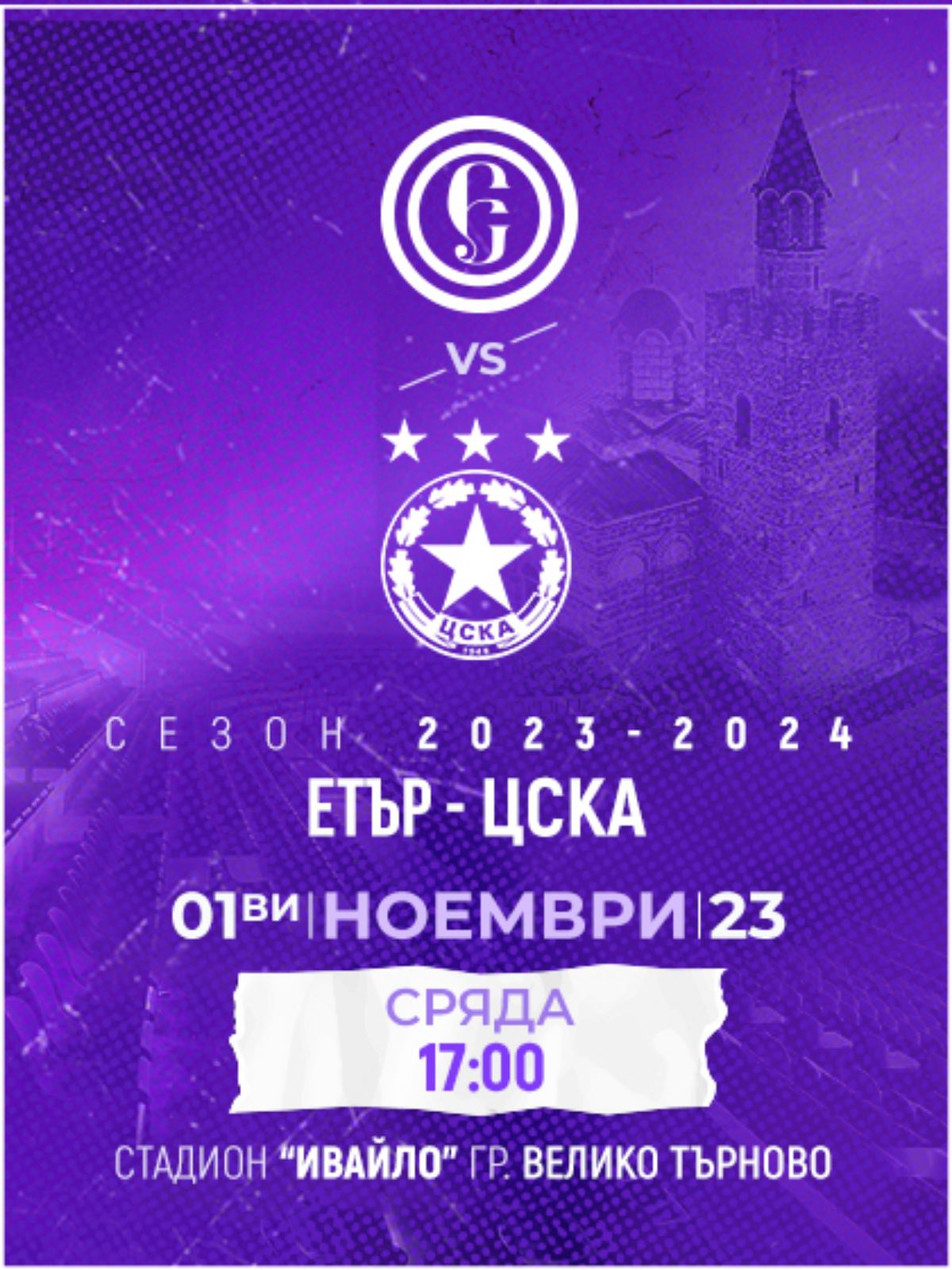В деня на мача (сряда) билетите ще се продават от 10 ч. във фен магазина, а касите от северната страна на стадион „Ивайло“ за феновете на „Етър“ и южните каси за привържениците на ЦСКА ще бъдат отворени от 14:30 ч.