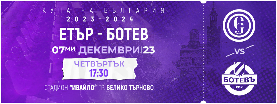 „Етър“ приема „Ботев“ (Пловдив) в осминафинален мач от турнира за Купата на България. Двубоят е утре от 17:30 ч. на стадион „Ивайло“. Волен Чинков ще ръководи мача, асистенти са му Дениз Соколов и Тодор Вуков, а съдийски наблюдател – Милко Николов.