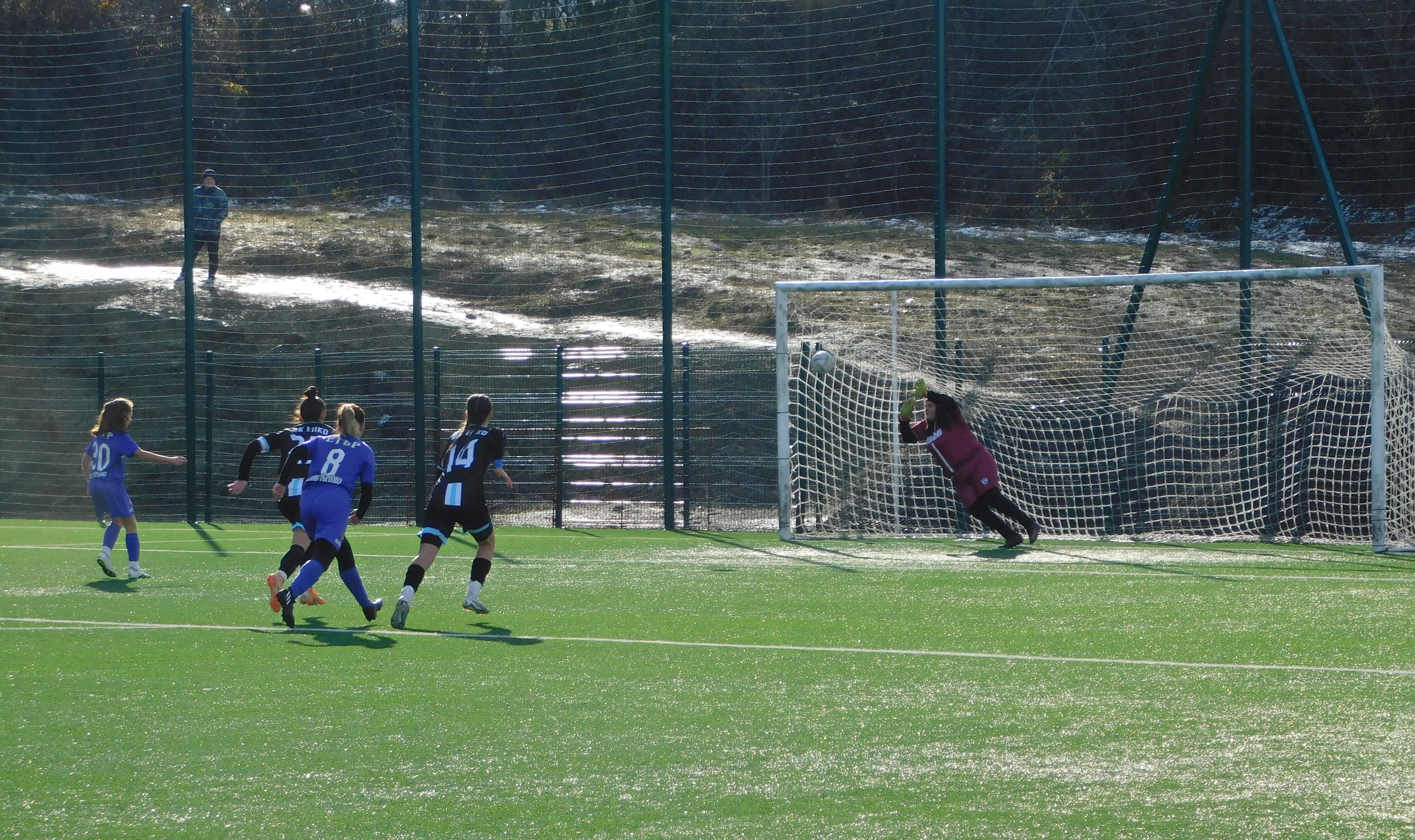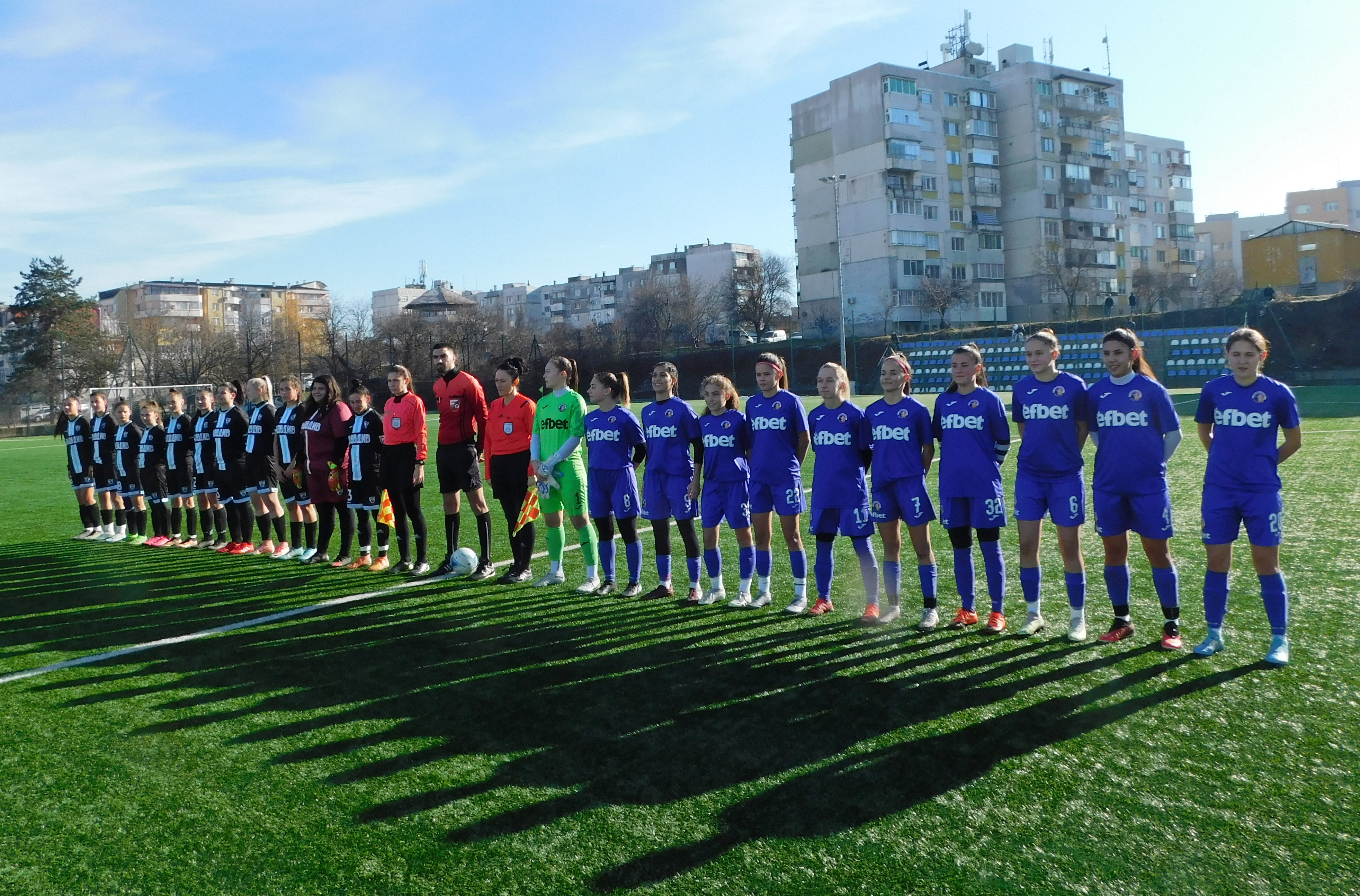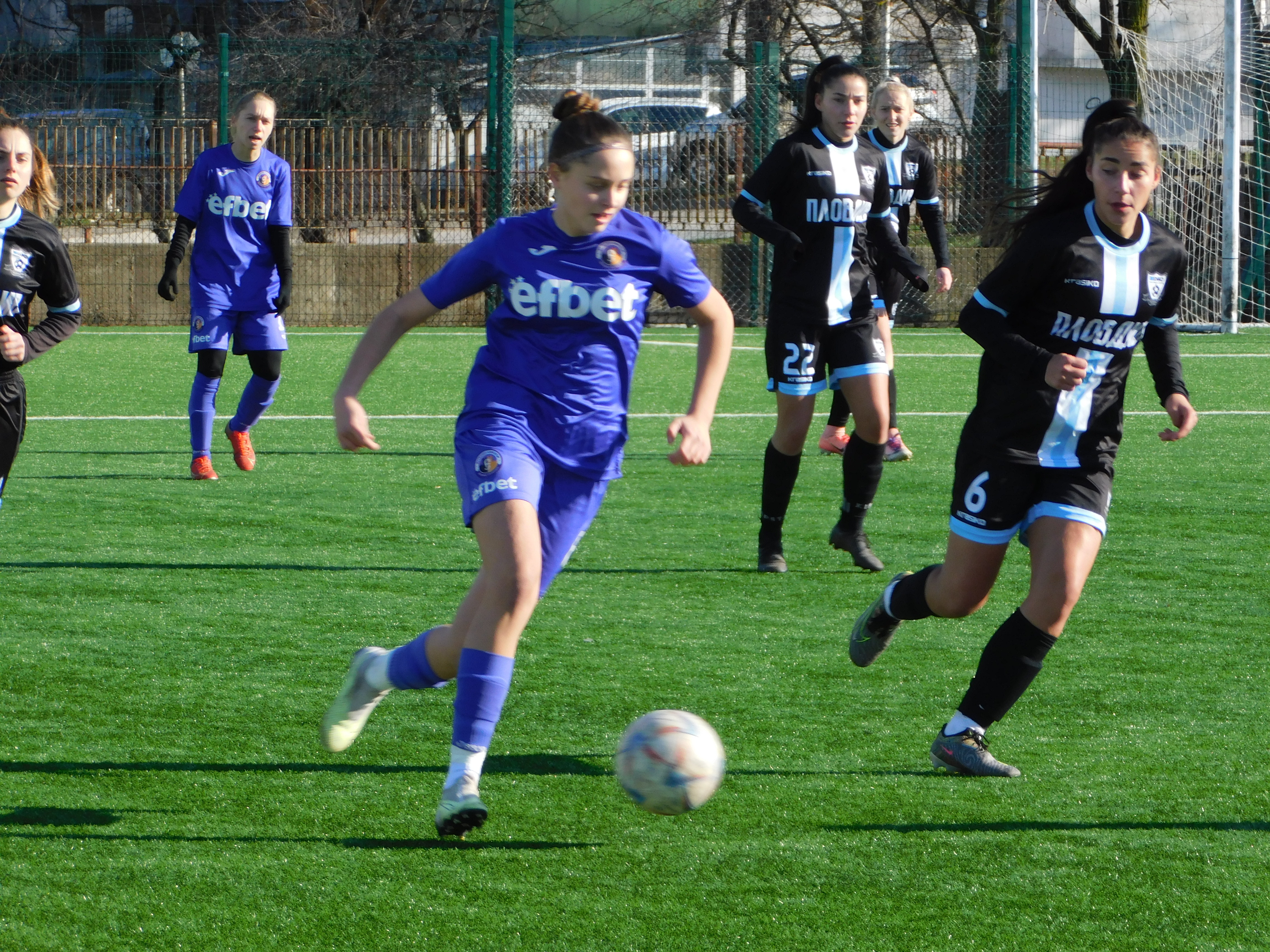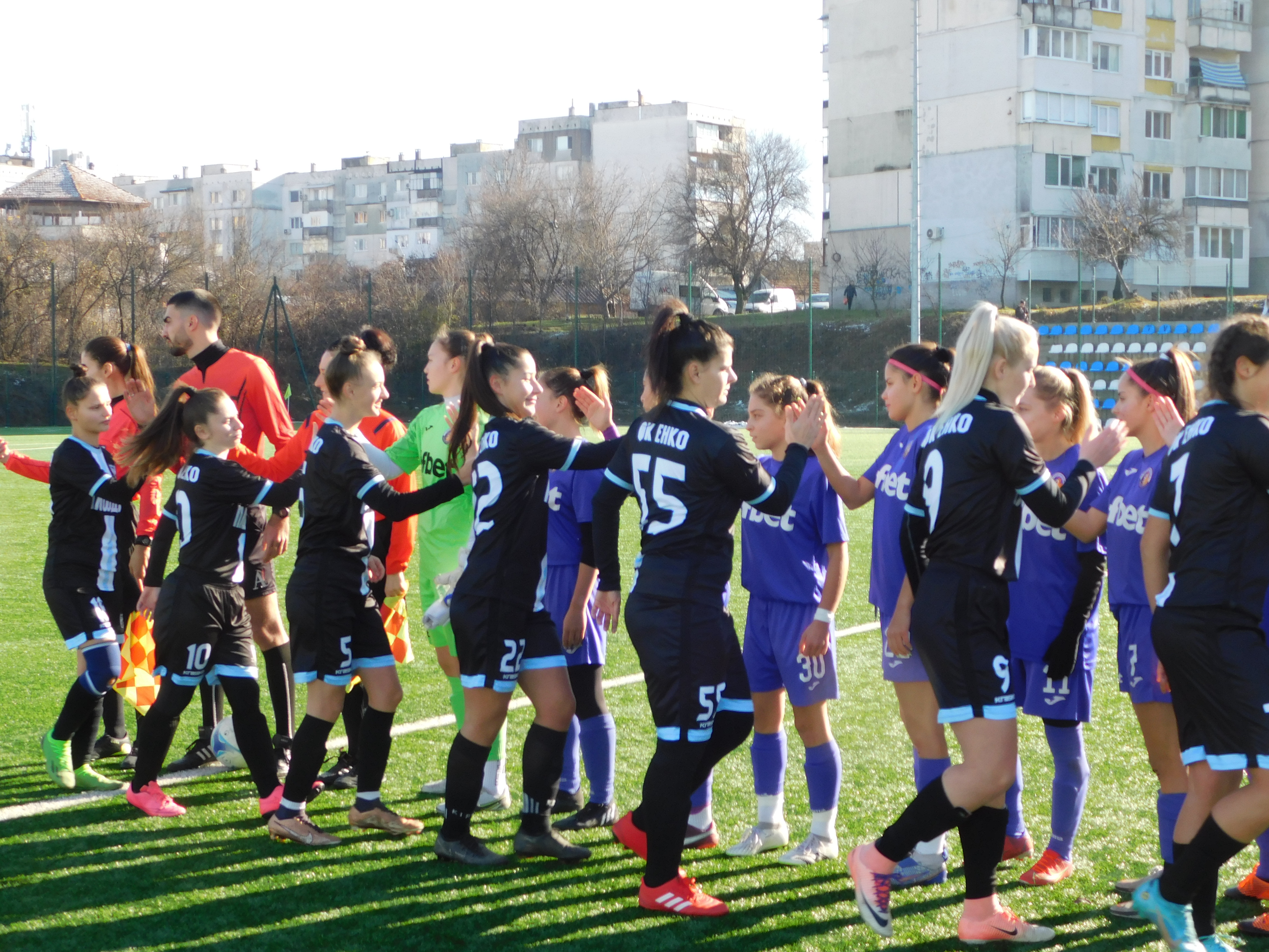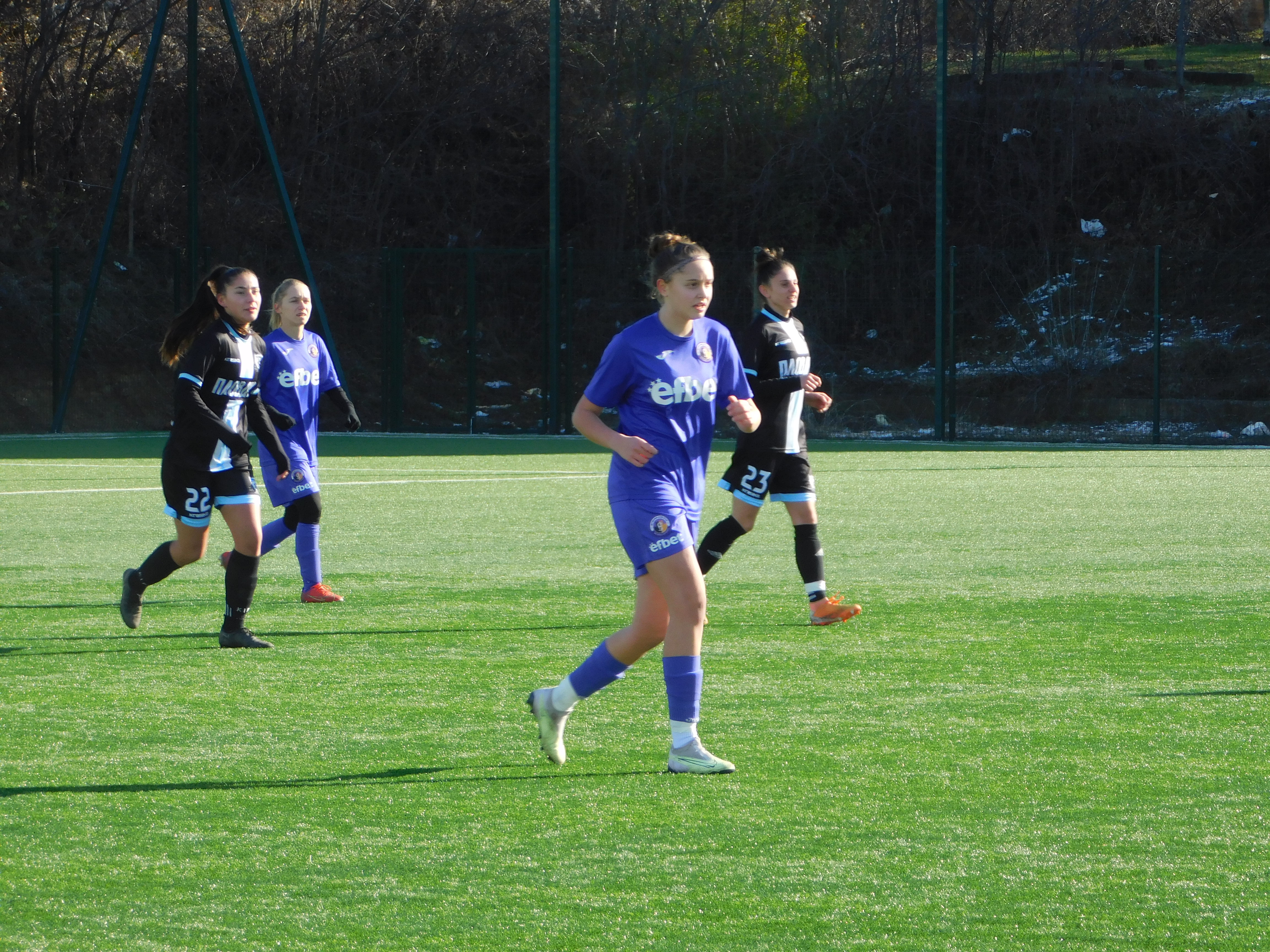 В 33-ата минута Анастасия Трифонова опита удар от фаул, но вратарката Костова безпроблемно улови. Минута по-късно обаче етърки поведоха. Атака отдясно, започнала от Михаела Михайлова, премина през Мирела Моева и топката стигна до Анджелина Динева, която с удар в ъгъла откри – 1:0. Малко преди почивката след корнер Моева опита удар, който обаче не донесе нищо.