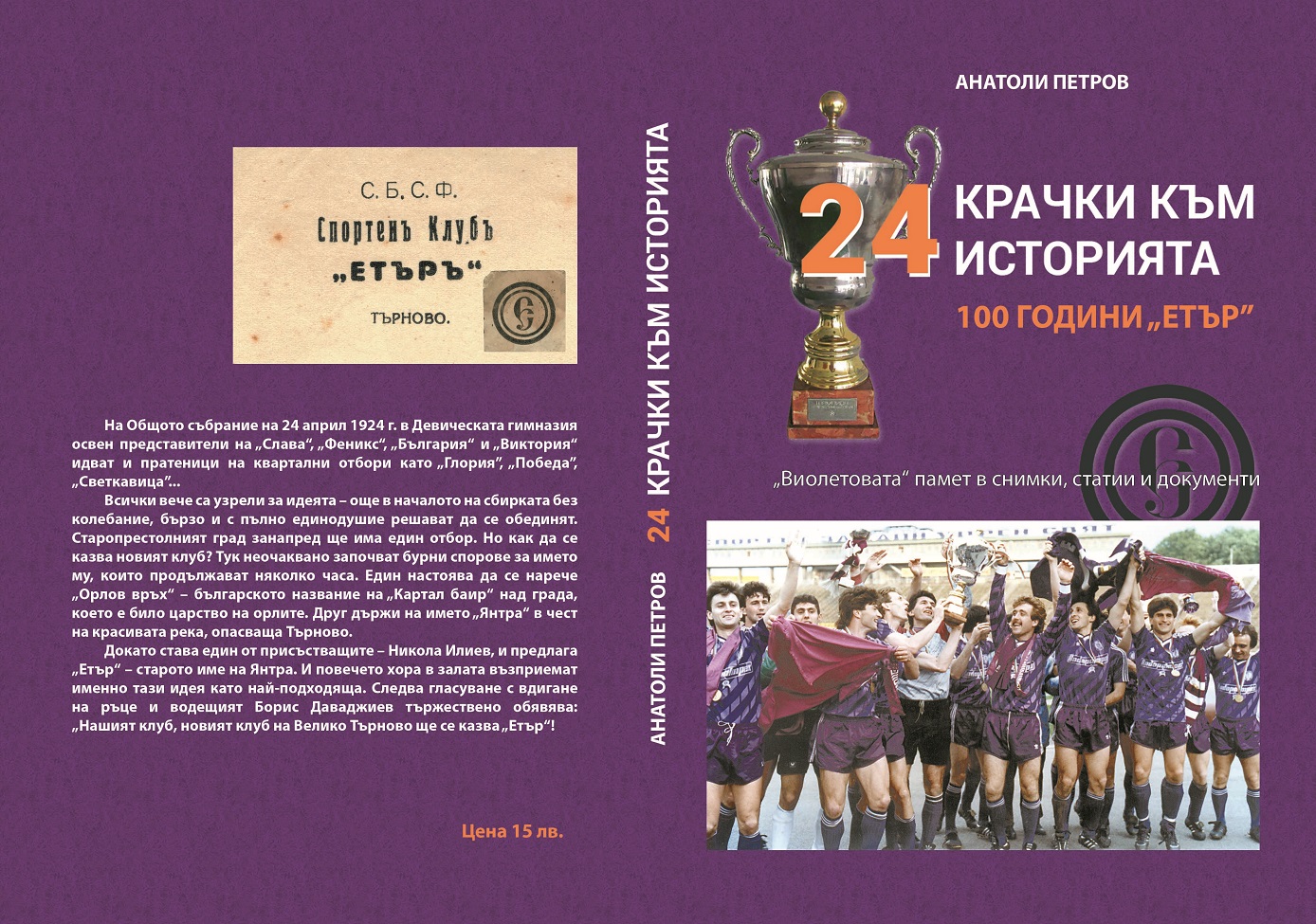 „24 крачки към историята. 100 години „Етър“ – така се нарича новата книга на Анатоли Петров, посветена на вековния юбилей на великотърновския клуб. В 224-те страници на изданието има редица непубликувани досега събития, факти, снимки, документи, които за първи път стават публично достояние и хвърлят нова светлина върху славната стогодишна история на „Етър“!