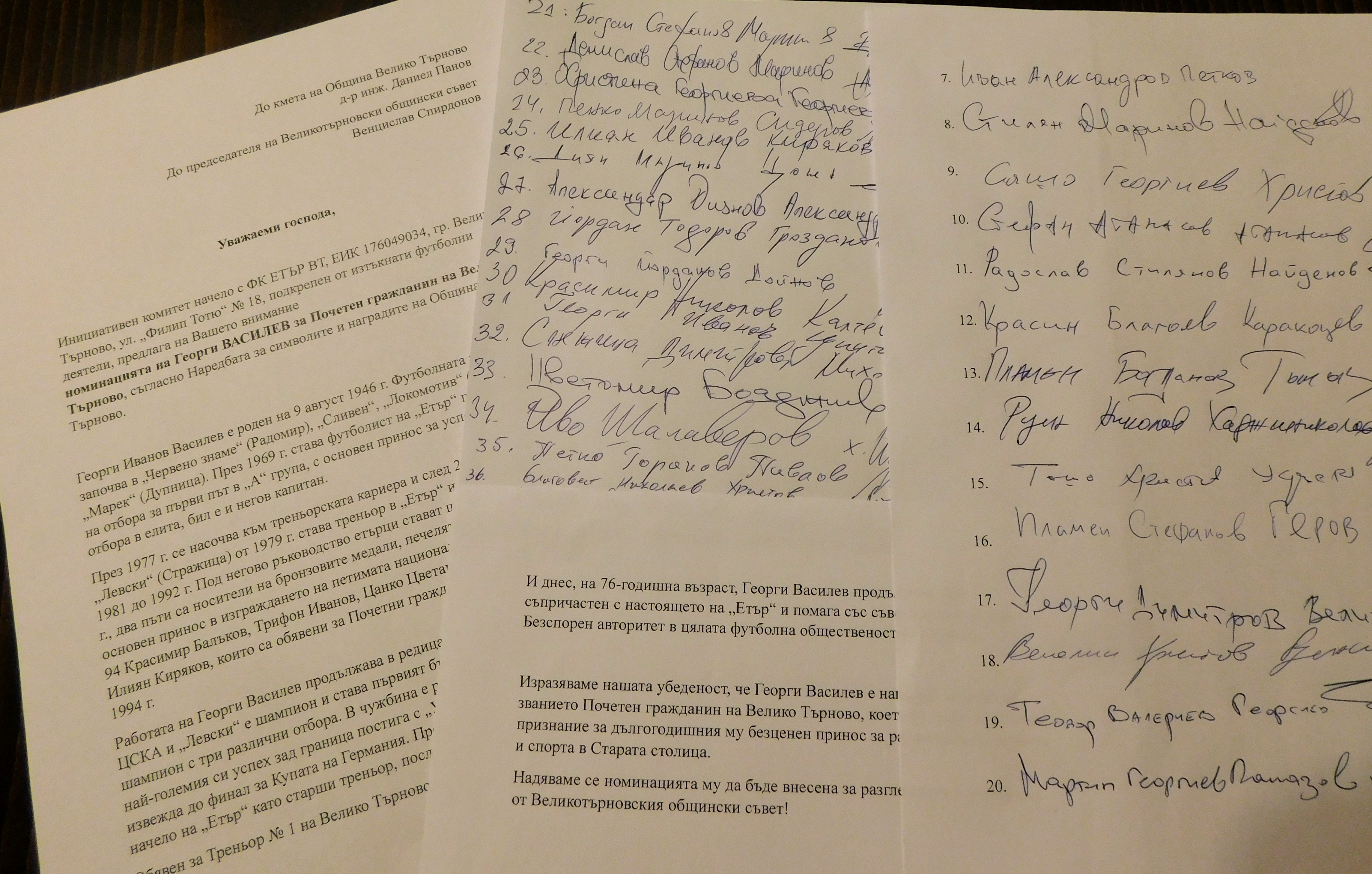 „И днес, на 76-годишна възраст, Георги Василев продължава да е съпричастен с настоящето на „Етър“ и помага със съвети и експертиза. Безспорен авторитет в цялата футболна общественост на страната. Изразяваме нашата убеденост, че Георги Василев е напълно достоен за званието Почетен гражданин на Велико Търново, което би било заслужено признание за дългогодишния му безценен принос за развитието на футбола и спорта в Старата столица“, се казва в предложението.