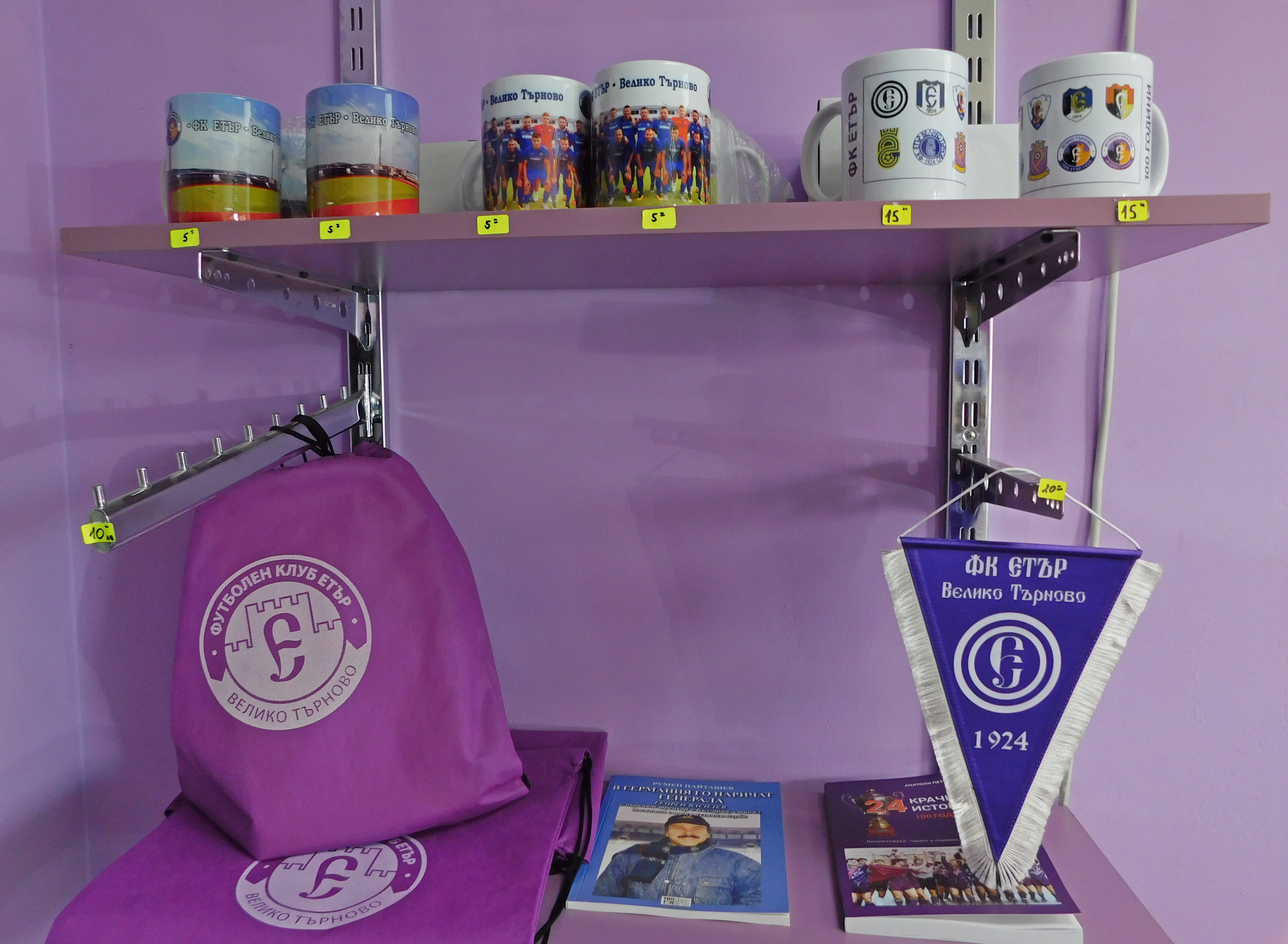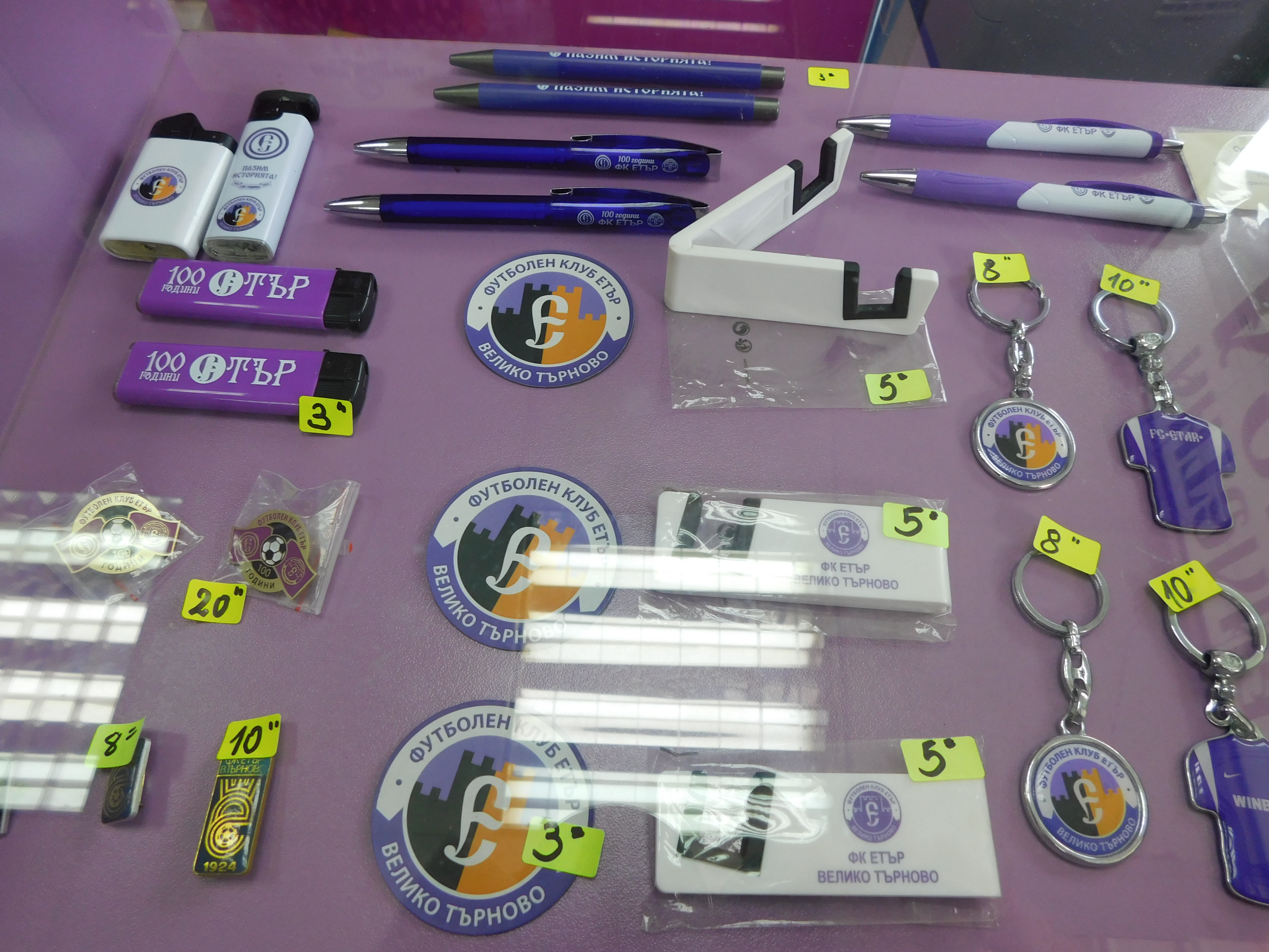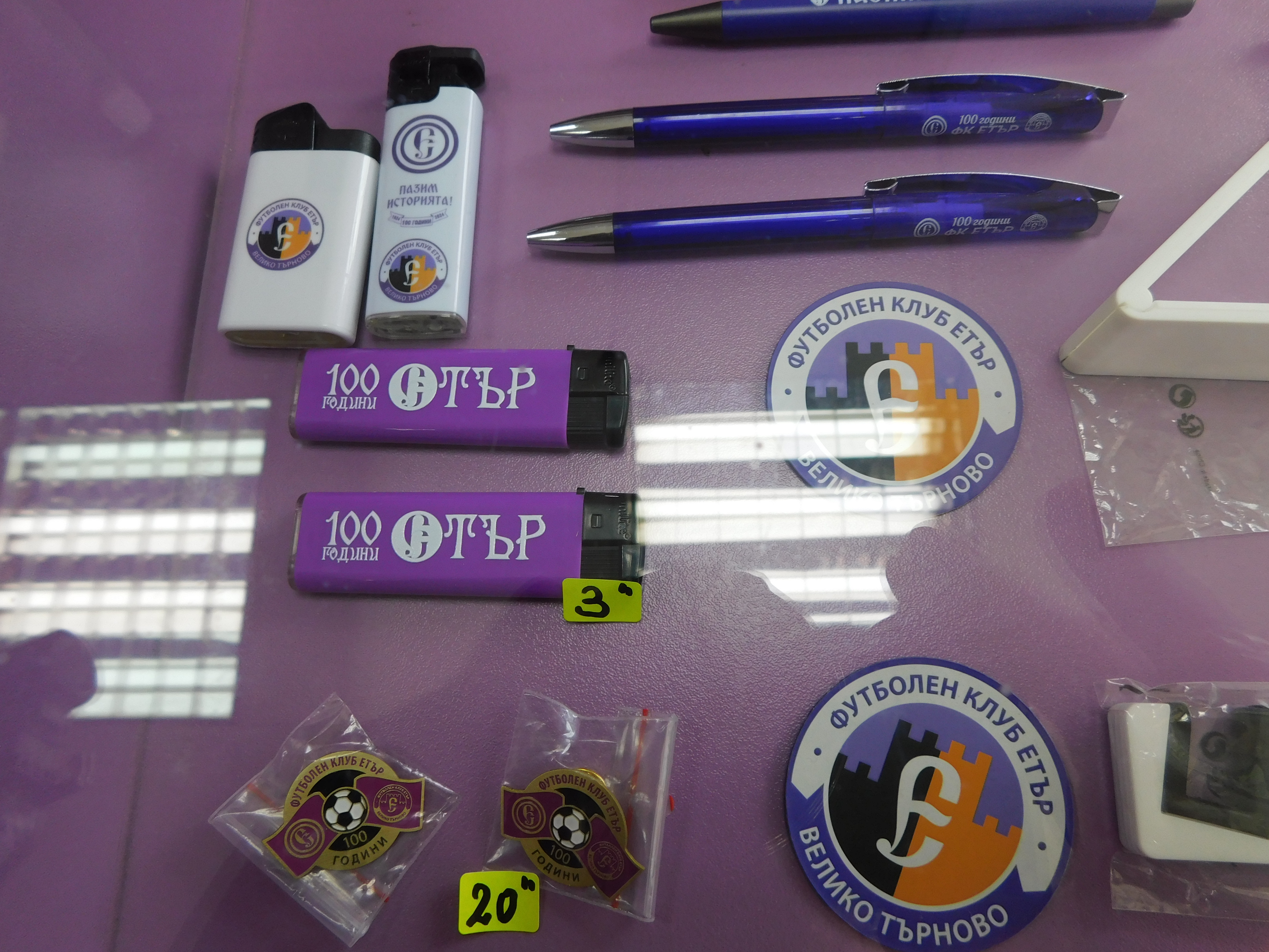 „Етър“ пусна в продажба и серия от артикули, свързани с вековния юбилей на клуба. Сред тях са юбилейна значка, която е само в лимитиран тираж от 100 броя, шалове, възпоменателни флагчета, други значки, шапки, чаши, химикали, запалки, стикери… Всички артикули можете да намерите във фен магазина, който ще бъде отворен от четвъртък в 14:30 ч.