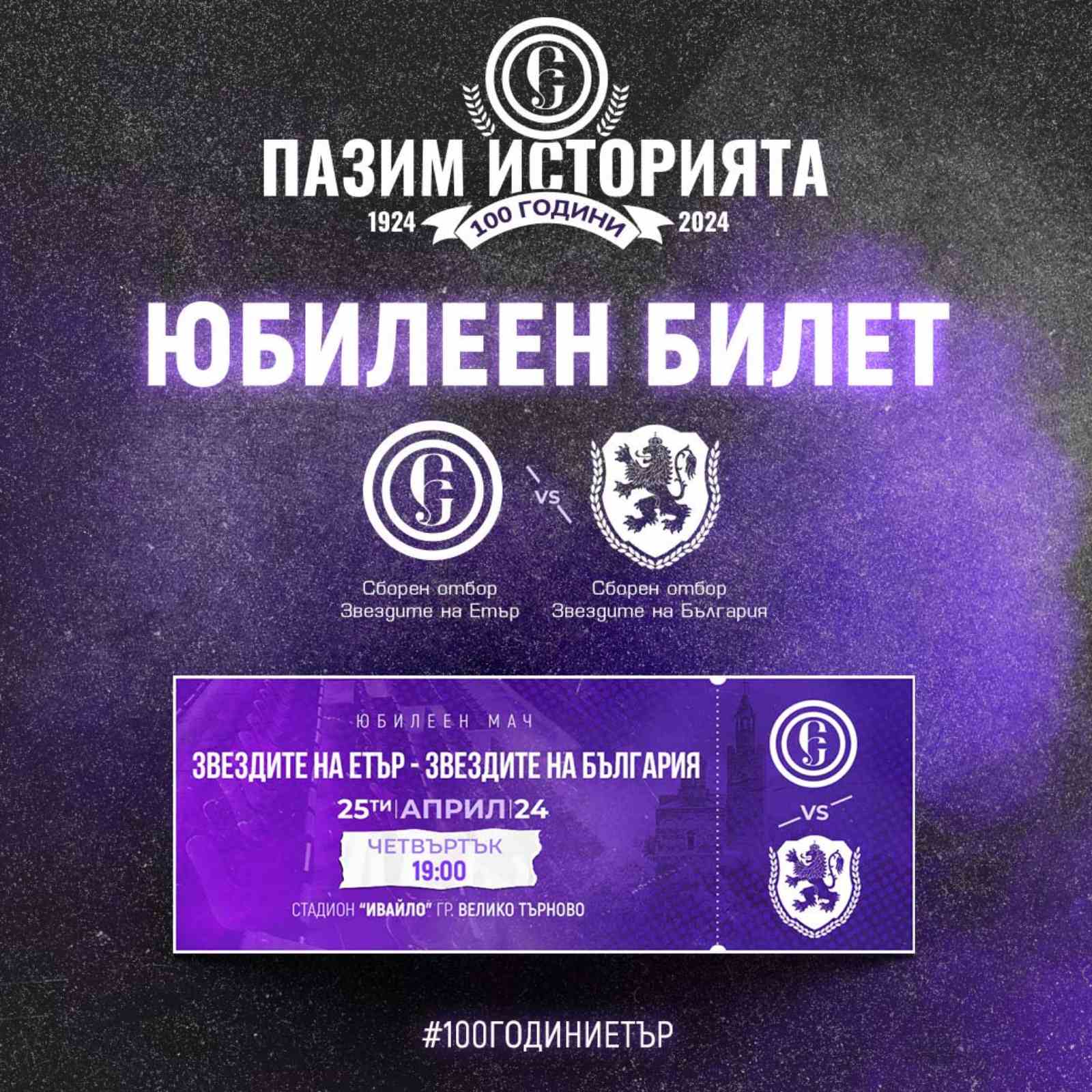 „Етър“ обаче пуска в продажба колекционерски юбилейни билети. Те са на цена 10 лв. и са за всички, които желаят да подпомогнат клуба и да допринесат за юбилея! Билетите ще могат да се купуват в четвъртък от 14:30 ч. във фен магазина, както и на касите на стадиона. Те се продават вече и в мрежата на Eventim тук.