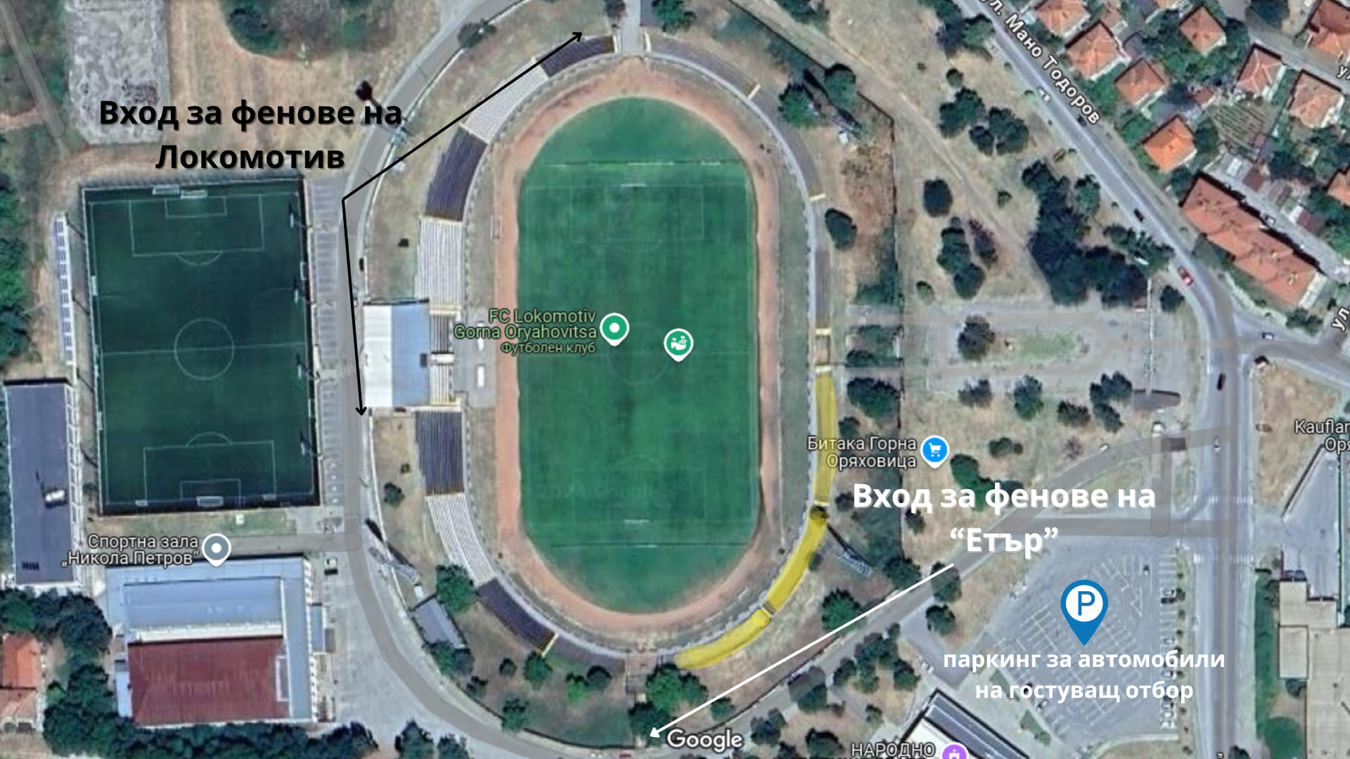 Феновете на „Етър“ ще влизат през южния вход (на схемата), като ще бъдат разположени в югоизточната част на трибуните. Билетите ще се купуват на две каси пред Южния вход, които ще отворят от 16:30 ч. Предварителна продажба на билети за “виолетовите” фенове към този момент не се предвижда.
