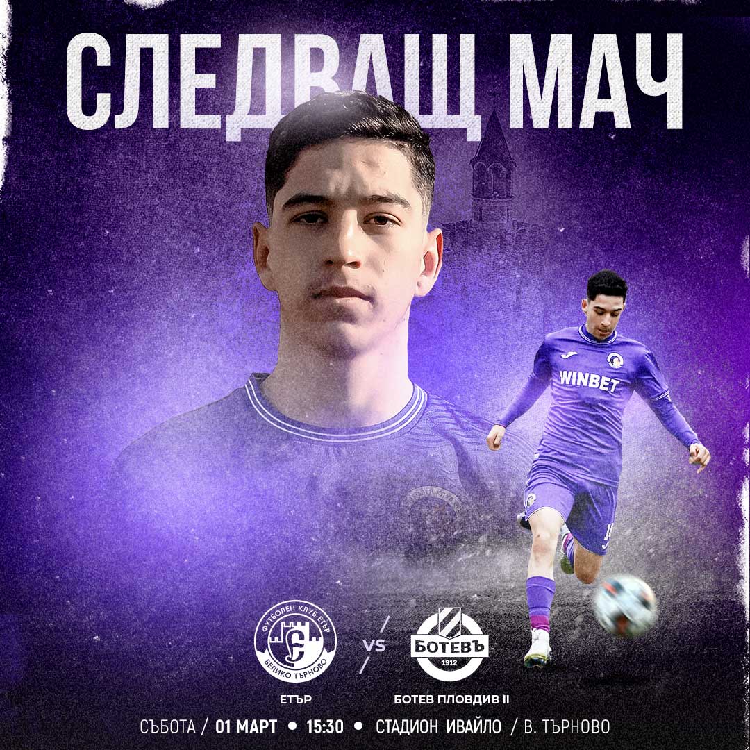 „Етър“ приема в събота втория тим на „Ботев“ (Пловдив) в поредния си важен мач! Двубоят е на 1 март от 15:30 ч. на стадион „Ивайло“. След успешния старт срещу „Беласица“ и последвалата загуба в Радомир „болярите“ са амбицирани да изиграят силен мач и зарадват феновете си с победа!
