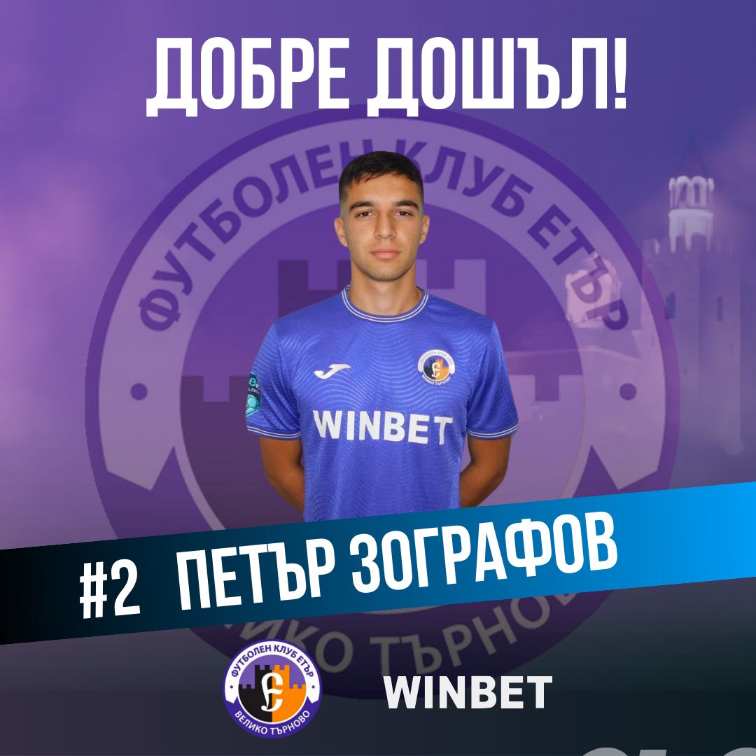 21-годишният защитник Петър Зографов е най-новото попълнение на „виолетовите“! Днес ръководството на клуба и футболистът подписаха договор и Зографов се присъедини към подготовката на тима за предстоящото домакинство срещу „Спартак“ (Плевен).