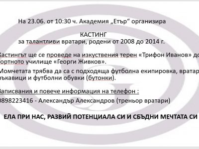 На 23.06. от 10:30 ч. Академия „Етър“ организира КАСТИНГ за талантливи вратари, родени от 2008 до 2014 г. Кастингът ще се проведе... Виж повече