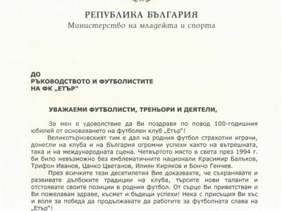 Министърът на младежта и спорта Георги Глушков поздрави „Етър“ за неговия стотен юбилей. Във великотърновския клуб бе получен поздравителен адрес, в който... Виж повече